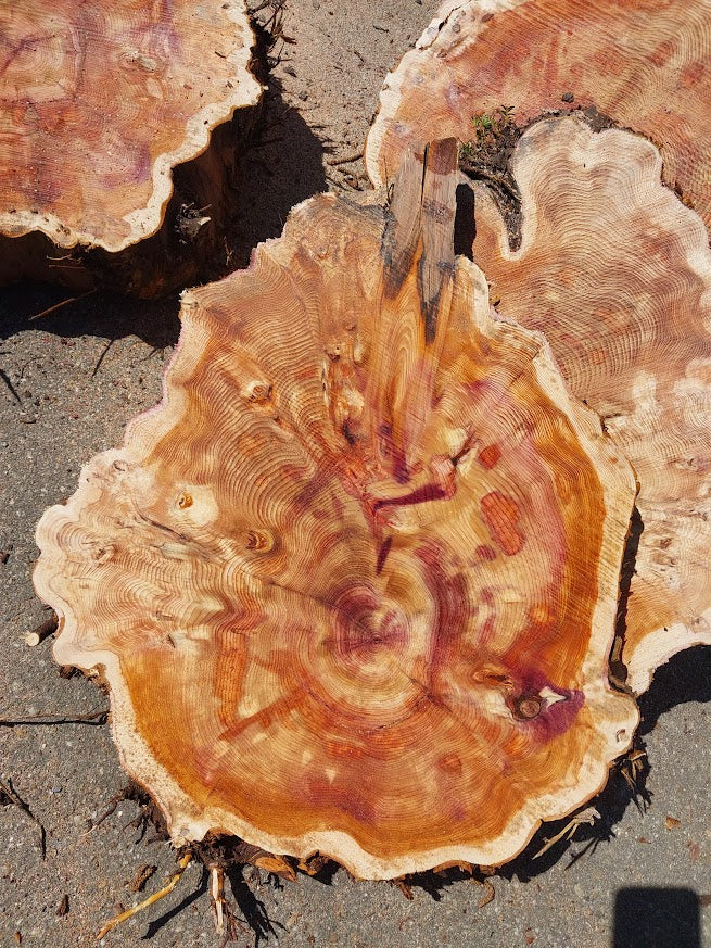 Baumscheiben mit besonders ausgefallenen Formen stammen häufig aus dem Wurzelbereich oder aus Gabelungen und sind somit nur in geringen Stückzahlen vorhanden. Es gibt jedoch hin und wieder auch mal ganze Stämme, die sehr speziell geformt sind.